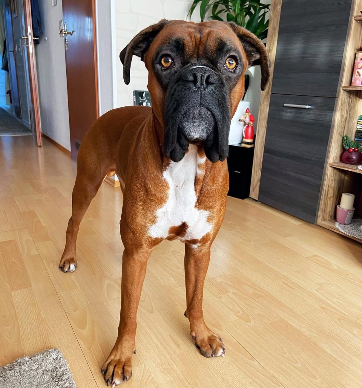 His alert posture and calm gaze reflect the Boxer’s well-known loyalty and people-focused personality, making him an excellent companion for active and loving families.